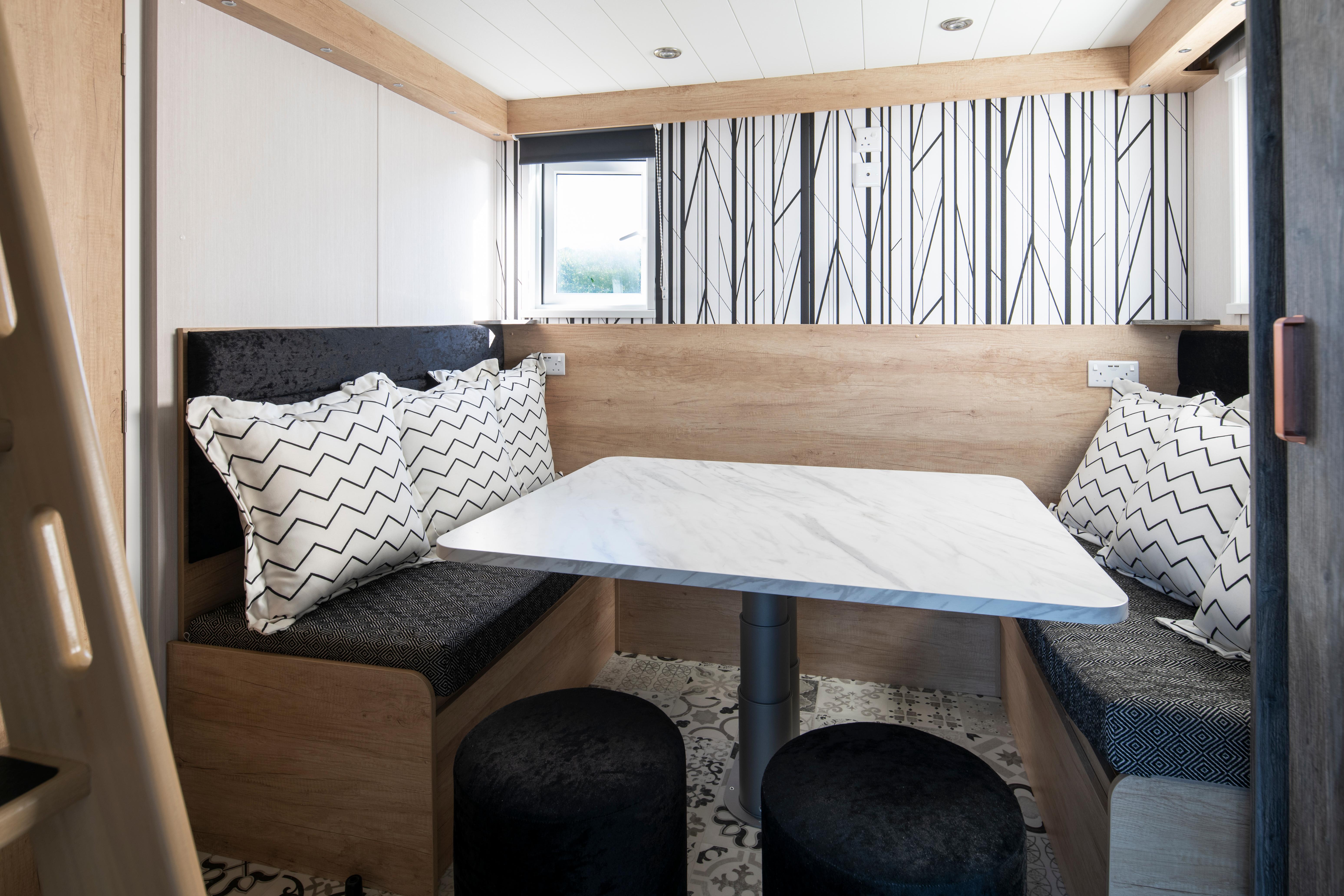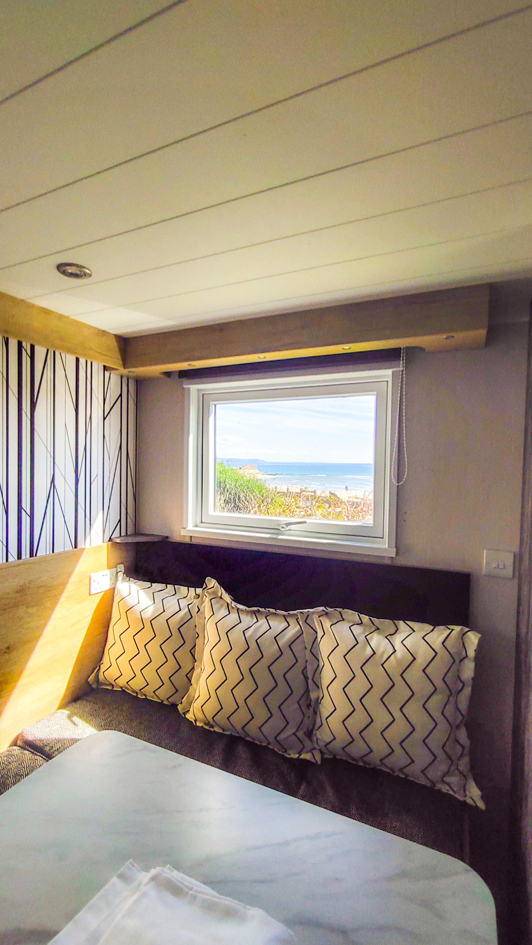 Our Glamping Pods offer a relaxing stay for those looking for a touch of luxury while enjoying the feel of touring around in the countryside. Each pod has a compact and open-plan layout, featuring a fully equipped kitchen and a comfortable living area with a corner sofa, smart TV and double doors leading onto your own private decking. These homes are perfect for couples or families looking to relax and unwind right beside the sea. At the back of the house sits a contemporary dining room with bright windows and cushioned booth-style seating. Here, you’ll find a compact bathroom with a toilet, sink and rainforest shower. Each house features a cosy mezzanine bedroom with twin beds, accessible by a vertical step ladder, for a quirky camping feel. The living room sofa and dining room seating areas both transform into double beds to create additional sleeping arrangements for up to 6 people. During May Half Term and Peak Summer Holidays, bookings must be for multiples of one week. At all other times, short breaks are welcomed. Short breaks are subject to a minimum of three nights. During the booking stage, an interactive map will appear, allowing you to pick the perfect spot for your stay.