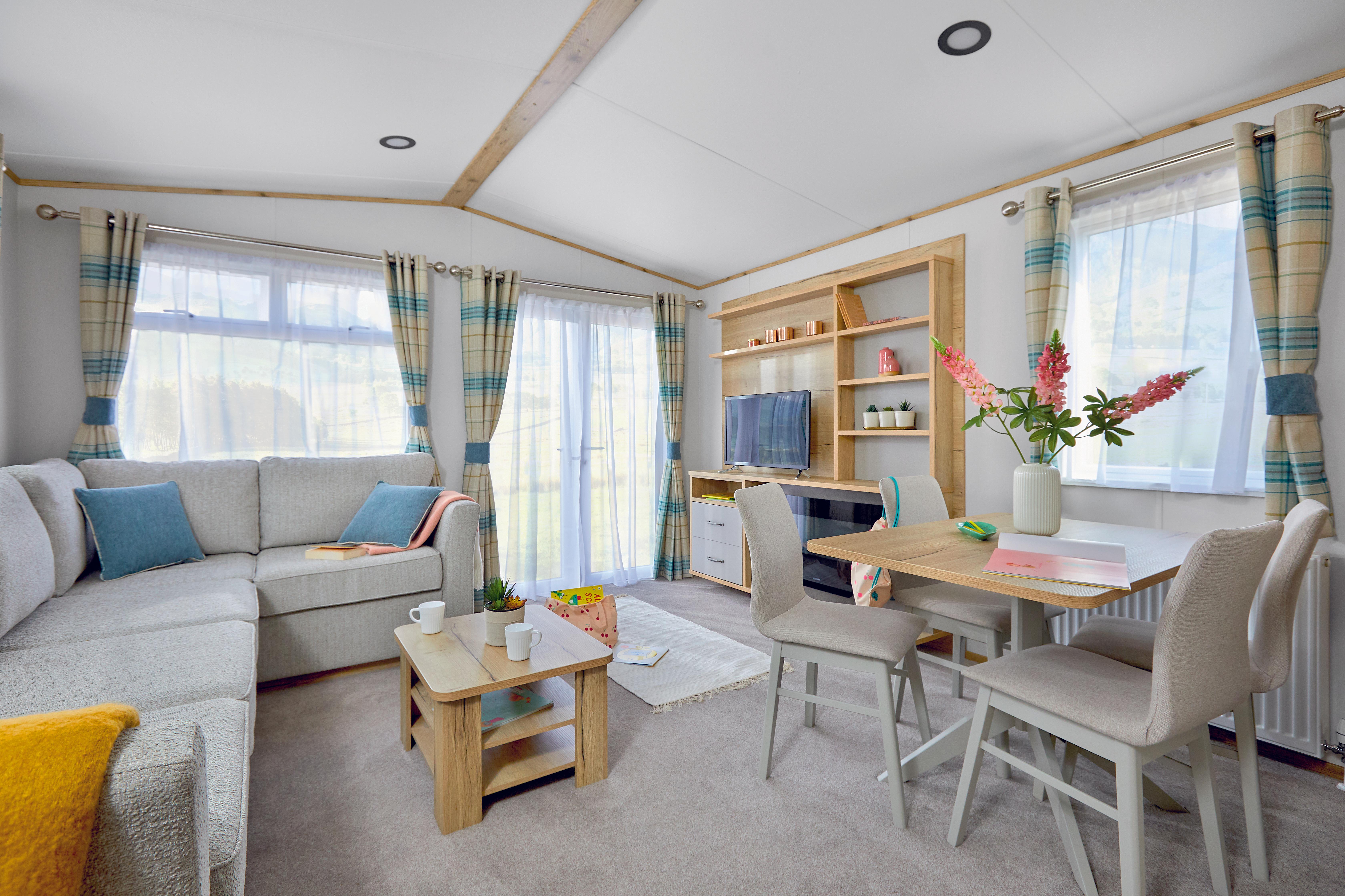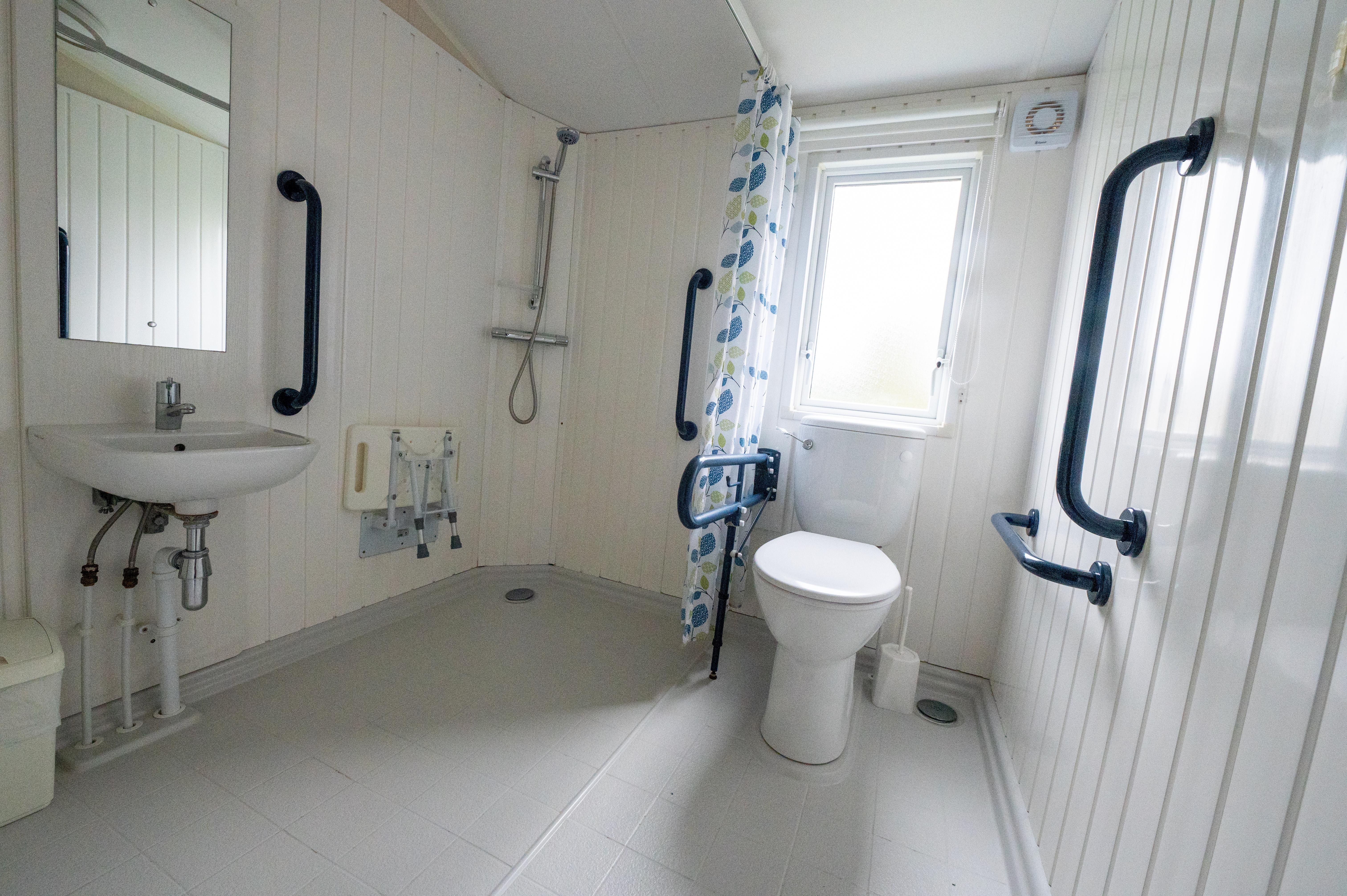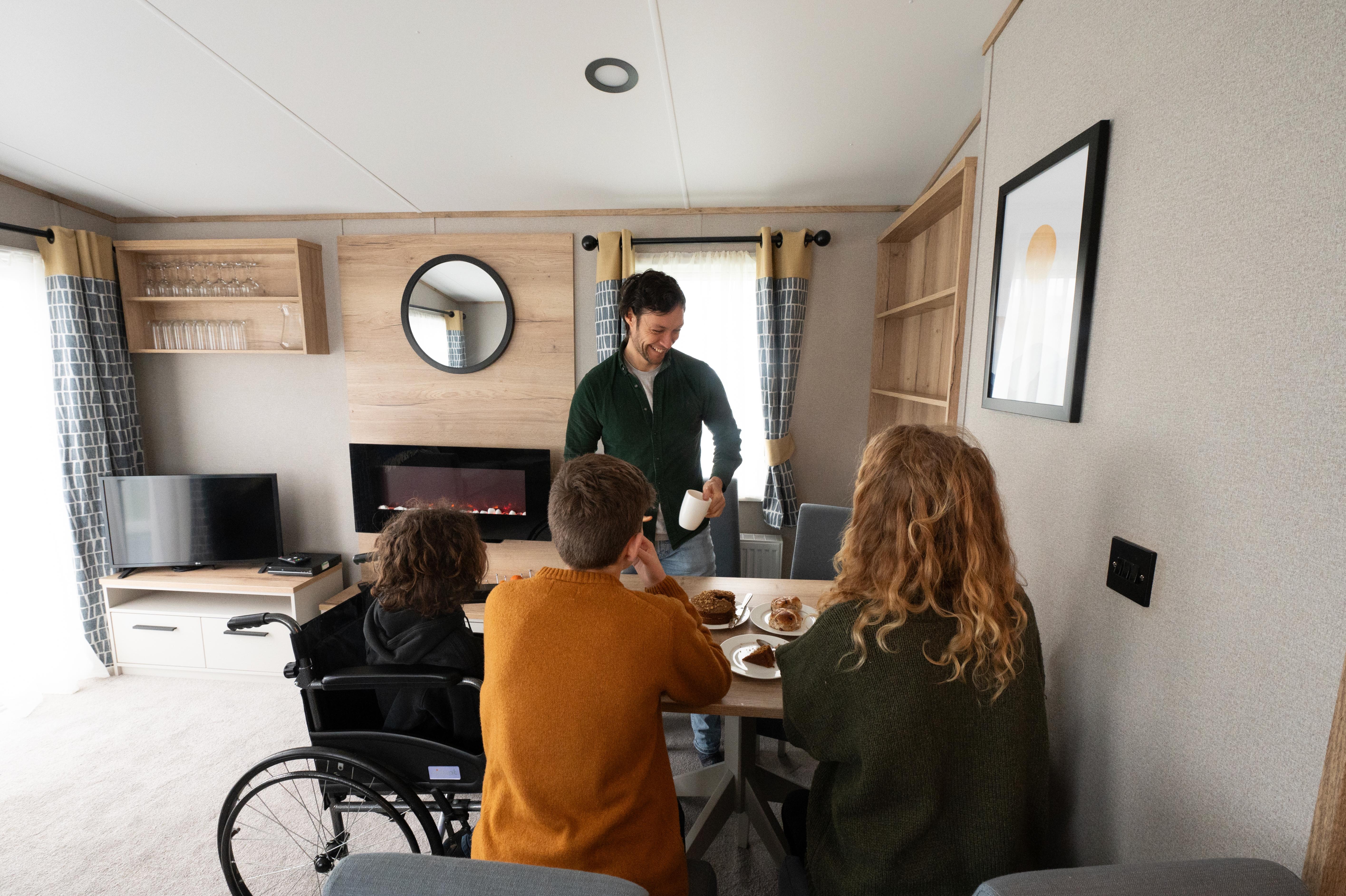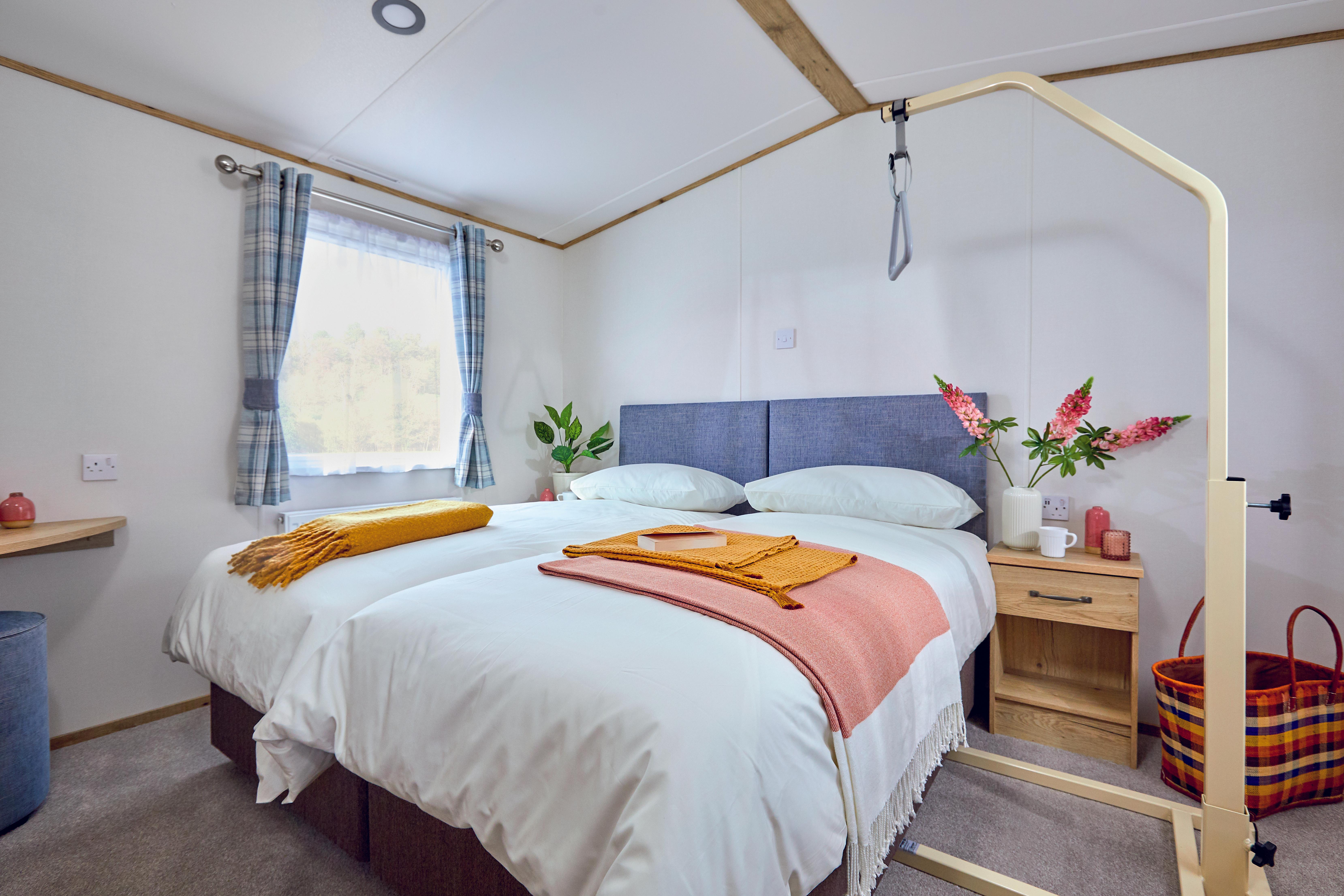 This spacious wheelchair-friendly two-bedroom holiday home boasts a generous sun deck with full ramped access, a private EV charger, and wider door frames throughout for full wheelchair accessibility. This modern luxury home comes complete a wet room with Doc M disability equipment as well as full kitchen facilities, double glazing, and central heating. The bright and airy lounge has a comfortable seating area with a Freeview TV and DVD player, and a dining table with moveable stools for wheelchair access. For your comfort, there is a patient helper apparatus in the main bedroom with two 3 ft divan beds which can easily be pushed together to make a 6 ft double. The second bedroom also has two 3 ft divan beds and sliding doors for ease of use. Please be aware this model has standard height base units in the kitchen area. During May Half Term and the Peak Summer Holidays, holiday home bookings must be for multiples of one week. At all other times, short breaks are welcomed. Short breaks are subject to a minimum of three nights. During the booking stage, an interactive map will appear, allowing you to pick the perfect spot for your stay. Initial prices are based on 4 people sharing. An additional 2 people can be added to the booking at our usual rate of £12.75 per person (under 3s free). These images are an example only.