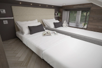Brand new for 2026, these upgraded homes feature two fixed bedrooms; one double room at the back, and one twin bed on a mezzanine* level, accessible by a step ladder.