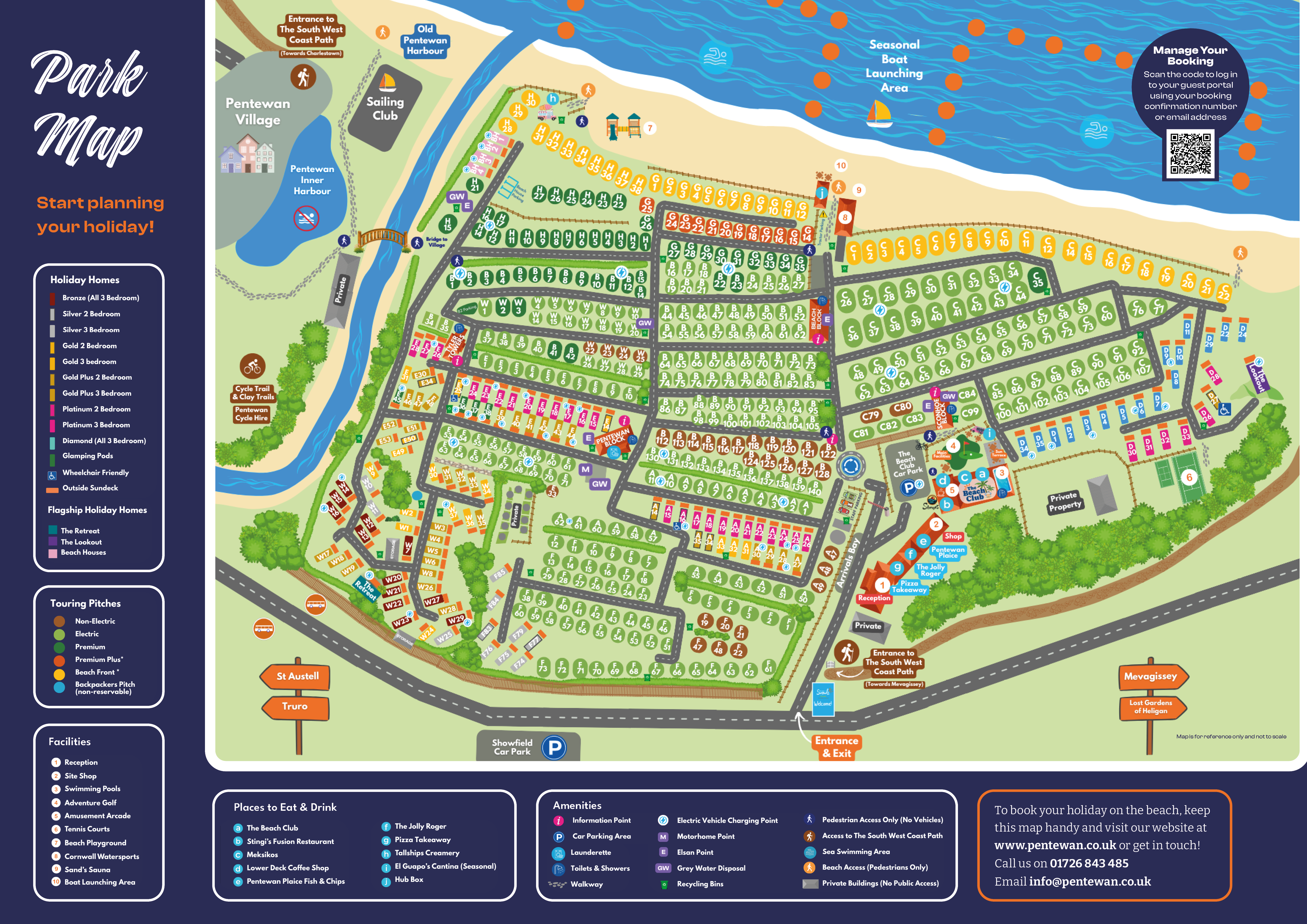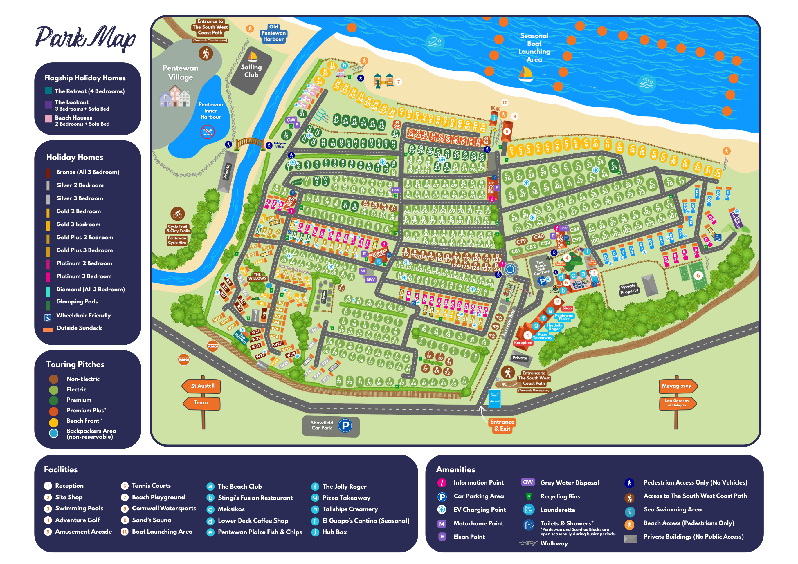 Choose your favourite holiday home or touring pitch on the map below, and start planning your Cornwall holiday! To book your dream getaway, enter your details into the search bar, email us at info@pentewan.co.uk or call us on 01726 843 485.