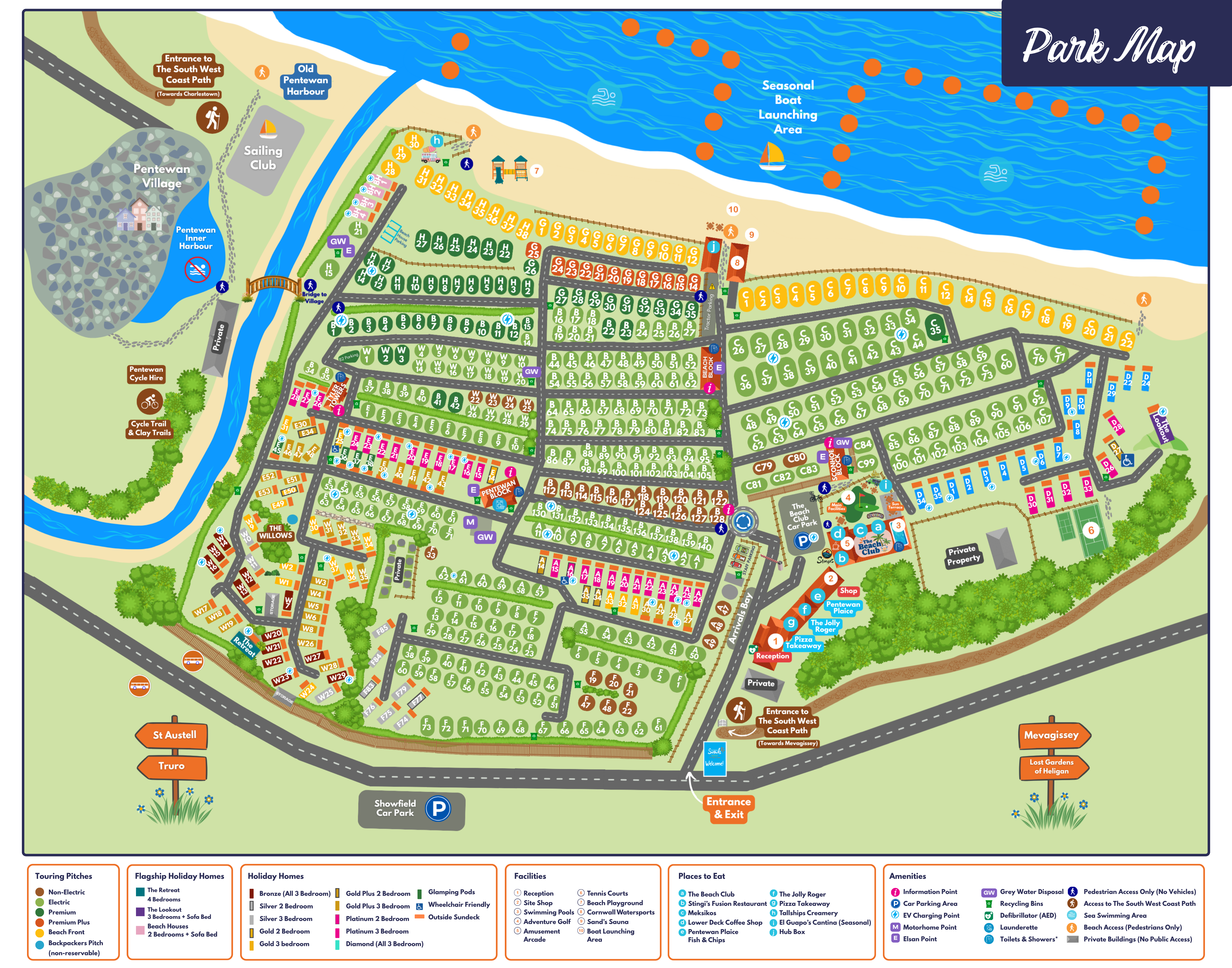 Choose your favourite holiday home or touring pitch on the map below, and start planning your Cornwall holiday! To book your dream getaway, enter your details into the search bar, email us at info@pentewan.co.uk or call us on 01726 843 485.